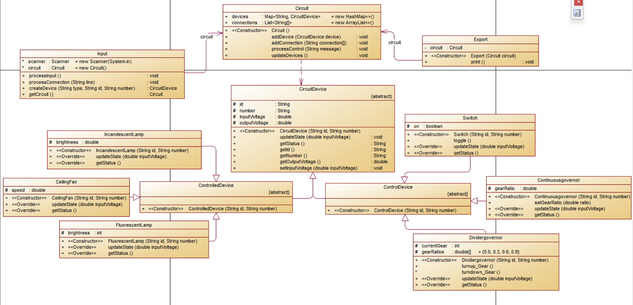 在模拟1中涉及对整个电路的结构设计,在参考设计后,我设计了一个二级继承模型,抽象类设备CircuitDevice,抽象类受控设备和控制设备分别继承设备类,具体的开关、分档调速器、白炽灯等则继承控制设备和受控设备。此外,我还创建了一个Circuit类用来保存电路信息,这是系统设计类图: