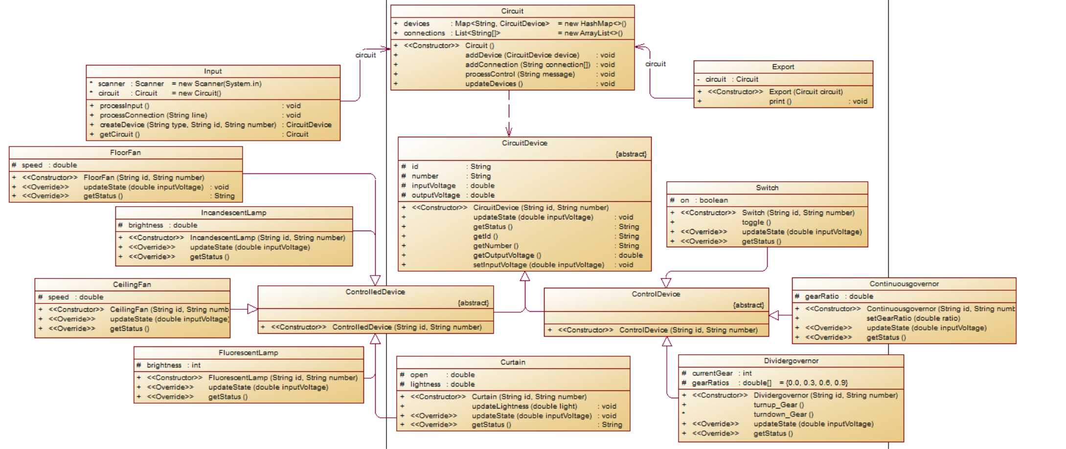 那么针对这三个问题,我在类设计上做了比较大的变动。首先是引脚信息问题,如果我将所有设备的引脚信息都存下来,这实际上是没有必要的,因为总干路总是从VCC开始,那么我只要知道这个设备第一次出现时的引脚是1还是2就可以了。因此我为设备创建了一个isNearVcc的布尔型参数,true表示1号引脚靠近VCC,false表示1号引脚靠近GND,在输出设备的两个引脚电压时,如果isNearVcc是true,那么输出就是inputVoltage-outputVoltage,否则就是outputVoltage-inputVoltage,这样,第一个问题就迎刃而解了。而改变这个参数的方法我写在changeDirection()函数中,用于在处理设备信息的函数中调用,如果第一次捕获到的设备引脚是1,就不调用,是2就调用函数改变isNearVcc。而针对互动开关,由于互动开关有三个引脚,而第一个引脚出现的位置可能是前方,也可能是后方,因此,没有在处理设备和存储设备的时候就对互动开关的方向进行判定,而是全部存储完了以后,在更新设备的第一步才对其进行方向判定。
