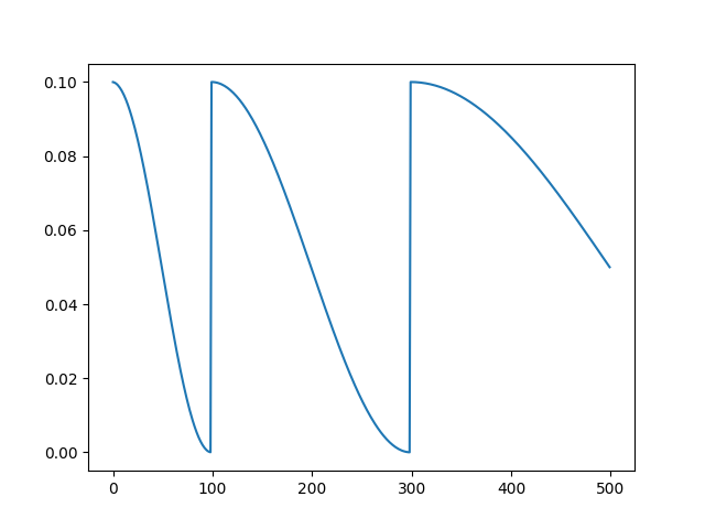 torch.optim.lr_scheduler.CosineAnnealingWarmRestarts(optimizer, T_0=100, T_mult=2)