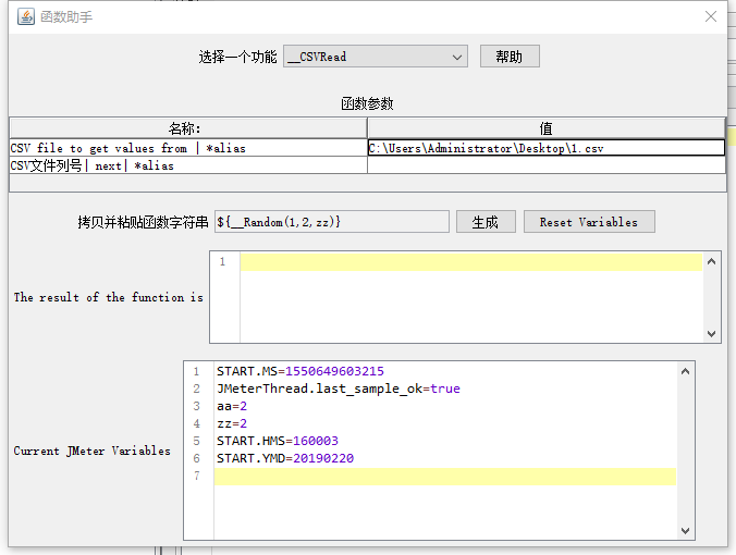 变量名称: ${__CSVRead(C:\Users\Administrator\1.csv,0)}