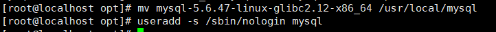 mv mysql-5.6.47-linux-glibc2.12-x86_64 /usr/local/mysql //移动到指定目录放入usr/local/mysql并改名为MySQL