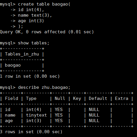 1 usr +数据库名字;//进入数据库 2 create table +名字( 3 字段名 类型(长度), 4 字段名 类型(长度), 5 ); //创建数据表 6 show tables; //查看数据表 7 describe +库名.表名 ;//查看某一表的具体结构 8 orop 表名;//删除数据表