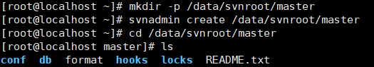mkdir -p /data/svnroot/master //创建文件夹 svnadmin create /data/svnroot/master //创建SVN空间环境 cd /data/svnroot/master//进入 ls //查看当前路径下的文件