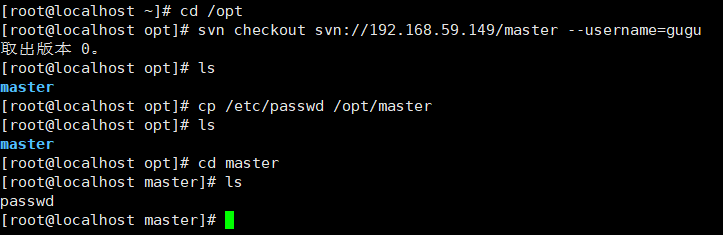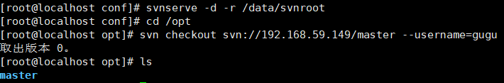 cd /opt //先进入想要存储项目的位置 svn checkout svn://IP/文件夹名称 --username=登陆账户名称//自行修改其中的部分参数