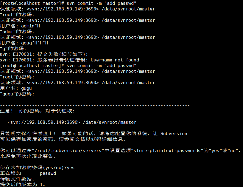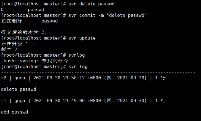 cp /etc/passwd /opt/myproject //复制粘贴一个文件到项目文件夹下 svn add 文件名//增加文件 svn commit -m "文件名" //提交文件更新 svn delete 文件名 //删除文件 svn commit -m "delete 文件名"//提交文件更新 svn log//查询日志