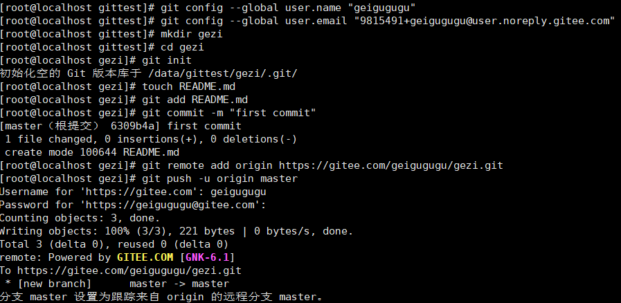 yum install -y git //安装Git mkdir -p /data/gittest //创建文件,当做git空间 cd /data/gittest //进入路径 git config --global user.name "用户名" //设置用户名 git congih --global user.email "邮箱" //设置邮箱 git init //创建git空间
