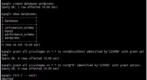 create database wordpress; grant all privileges on *.* to root@localhost identified by '000000' with grant option; grant all privileges on *.* to root@"%" identified by '000000' with grant option;