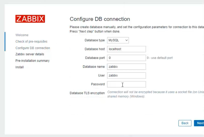 MariaDB [(none)]> create database zabbix character set utf8 collate utf8_bin; Query OK, 1 row affected (0.00 sec) MariaDB [(none)]> create user zabbix@localhost identified by '123456'; Query OK, 0 rows affected (0.00 sec) MariaDB [(none)]> flush privileges; Query OK, 0 rows affected (0.00 sec)