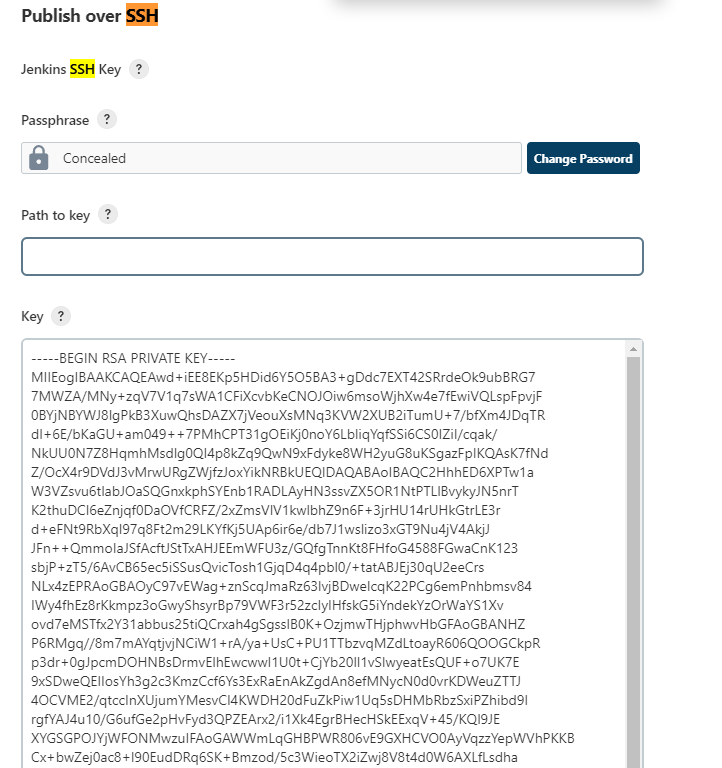 将刚才生成的服务器的私钥填入“Publish over SSH” 中的“key”