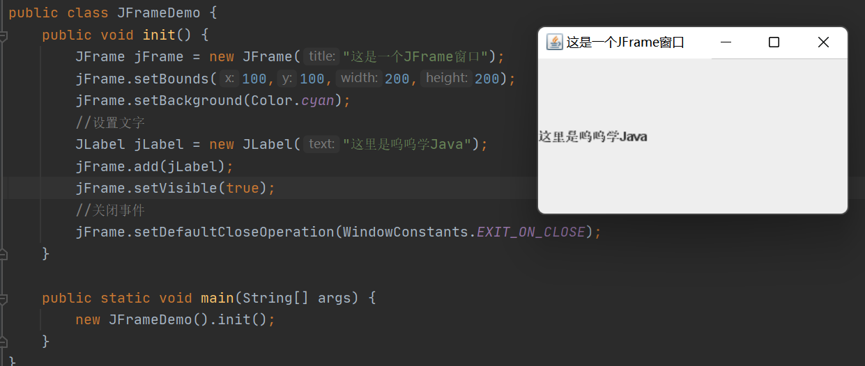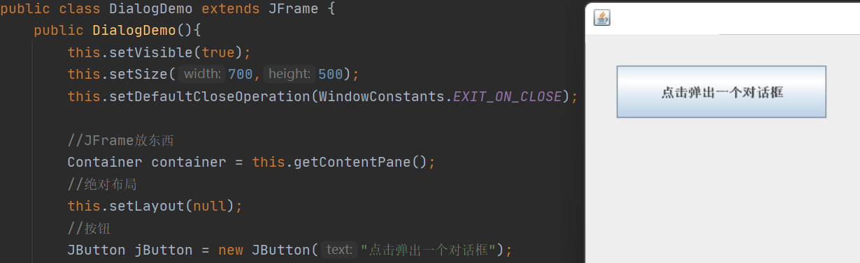 public class DialogDemo extends JFrame { public DialogDemo(){ this.setVisible(true); this.setSize(700,500); this.setDefaultCloseOperation(WindowConstants.EXIT_ON_CLOSE); //JFrame放东西 Container container = this.getContentPane(); //绝对布局 this.setLayout(null); //按钮 JButton jButton = new JButton("点击弹出一个对话框"); jButton.setBounds(30,30,200,50); container.add(jButton); //点击这个按钮的时候,弹出一个弹窗 jButton.addActionListener(new ActionListener() { @Override public void actionPerformed(ActionEvent e) { new MyDialogDemo(); } }); } public static void main(String[] args) { new DialogDemo(); } } class MyDialogDemo extends JDialog{ public MyDialogDemo(){ this.setVisible(true); this.setBounds(100,100,500,500); //this.setDefaultCloseOperation(WindowConstants.EXIT_ON_CLOSE);默认就有关不用再写闭事件, Container container=this.getContentPane(); container.add(new Label("快起来学习")); } }