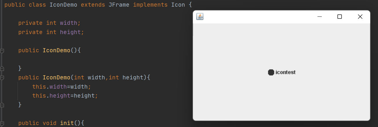 public class IconDemo extends JFrame implements Icon { private int width; private int height; public IconDemo(){ } public IconDemo(int width,int height){ this.width=width; this.height=height; } public void init(){ IconDemo iconDemo = new IconDemo(15, 15); //图标放在标签上,也可以放在按钮上 JLabel jLabel = new JLabel("icontest",iconDemo,SwingConstants.CENTER); Container container = this.getContentPane(); container.add(jLabel); this.setVisible(true); this.setDefaultCloseOperation(WindowConstants.EXIT_ON_CLOSE); } public static void main(String[] args) { new IconDemo().init(); } @Override public void paintIcon(Component c, Graphics g, int x, int y) { g.fillOval(x,y,width,height); } @Override public int getIconWidth() { return this.width; } @Override public int getIconHeight() { return this.height; } }