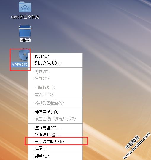 ----完成步骤1后,桌面上会生成一个vmware tools的dvd光盘,选中光盘单击右键--在终端中打开