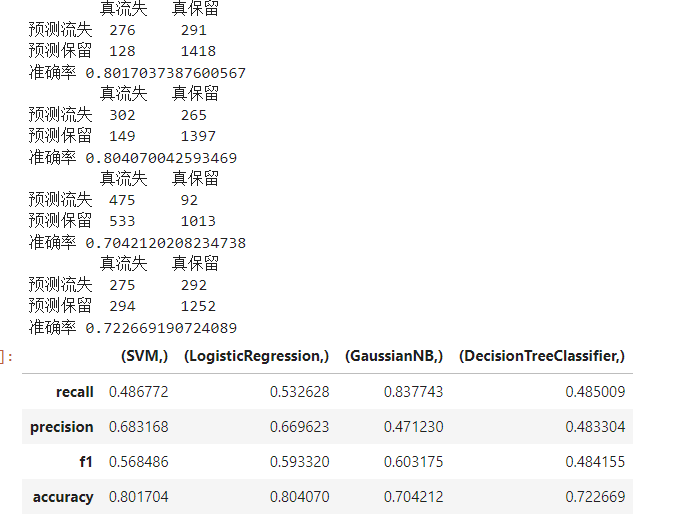 class_eva = pd.DataFrame([recall,precision,f1,acc])#将召回率、精确率和f1分数放在df中,方便接下来对比
