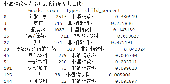 # 先筛选“非酒精饮料”类型的商品,然后求百分比,然后输出结果到文件。 selected = sort_links.loc[sort_links['Types'] == '非酒精饮料'] # 对所有的“非酒精饮料”求和 child_nums = selected['id'].sum() # 求百分比 selected.loc[:,'child_percent'] = selected.apply(lambda line: line['id']/child_nums,axis = 1) selected.rename(columns = {'id':'count'},inplace = True) print('非酒精饮料内部商品的销量及其占比:\n',selected) outfile2 = './child_percent.csv' sort_link.to_csv(outfile2,index = False,header = True,encoding='gbk') # 输出结果