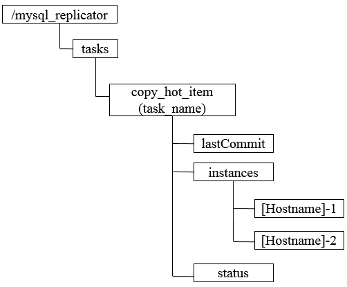 - 任务热备份,为了应对任务故障或者复制任务所在主机故障,复制组件采用"热备份"的容灾方式,即将同一个复制任务部署在不同的主机上,主备任务机通过Zookeeper互相检测运行监控状况。无论在第一步是否创建了任务节点,每台机器都需要在/mysql_replicator/tasks/copy_hot_item/instrances节点上将自己的主机名注册上去,节点类型为临时顺序节点,在完成子节点创建后,每天任务机器都可以获取到自己创建的节点名及所有子节点列表,然后通过对比判断自己是否是所有子节点中序号最小的,若是,则将自己运行状态设置为RUNNING,其他机器设置为STANDBY,这种策略称为小序号优先策略。