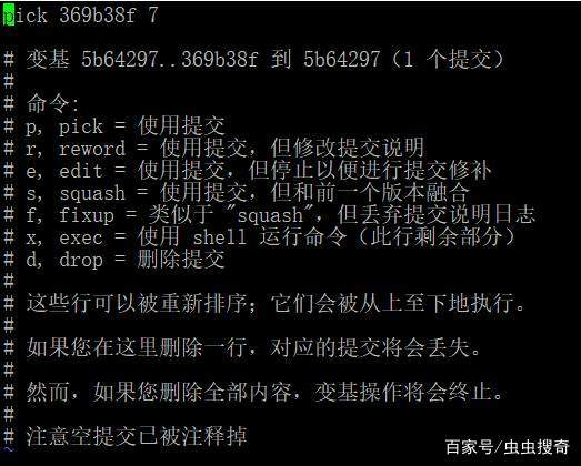 假设我们要重命名commit 5的注释为"chongchong"。因为要更改特定的commit,我们必须使用交互模式。在交互模式中,我们为分支设置基础(commit 4)并让它保持不变,并在我们的文本编辑器中触发提示,以选择我们想要基础。