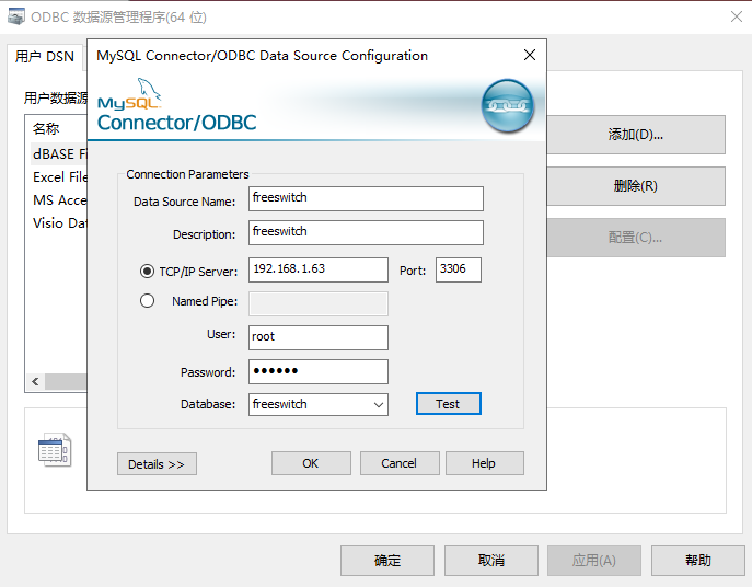 <param name=”core-db-dsn” value=”freeswitch(数据库名):root(数据库用户):’(数据库密码)’ />