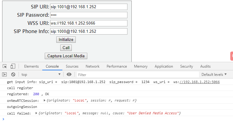 initialize: 注册成功,呼叫失败,用户拒绝媒体访问