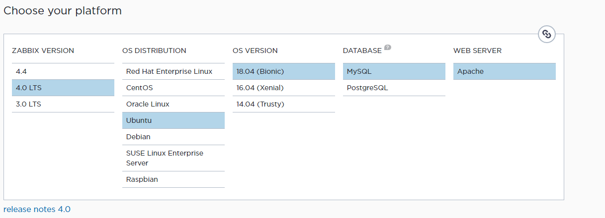 $ wget http://repo.zabbix.com/zabbix/3.4/ubuntu/pool/main/z/zabbix-release/zabbix-release_3.4-1+bionic_all.deb --2018-06-14 08:00:08-- http://repo.zabbix.com/zabbix/3.4/ubuntu/pool/main/z/zabbix-release/zabbix-release_3.4-1+bionic_all.deb Resolving repo.zabbix.com (repo.zabbix.com)... 162.243.159.138 Connecting to repo.zabbix.com (repo.zabbix.com)|162.243.159.138|:80... connected. HTTP request sent, awaiting response... 200 OK Length: 3952 (3.9K) [application/octet-stream] Saving to: ‘zabbix-release_3.4-1+bionic_all.deb’ $ sudo dpkg -i zabbix-release_3.4-1+bionic_all.deb Selecting previously unselected package zabbix-release. (Reading database ... 109198 files and directories currently installed.) Preparing to unpack zabbix-release_3.4-1+bionic_all.deb ... Unpacking zabbix-release (3.4-1+bionic) ... Setting up zabbix-release (3.4-1+bionic) ... $ sudo apt-get install zabbix-agent Reading package lists... Done Building dependency tree Reading state information... Done The following NEW packages will be installed: zabbix-agent 0 upgraded, 1 newly installed, 0 to remove and 2 not upgraded. Need to get 197 kB of archives. After this operation, 664 kB of additional disk space will be used. Get:1 http://mirrors.digitalocean.com/ubuntu bionic/universe amd64 zabbix-agent amd64 1:3.0.12+dfsg-1 [197 kB] Fetched 197 kB in 3s (71.3 kB/s) Selecting previously unselected package zabbix-agent.... .....