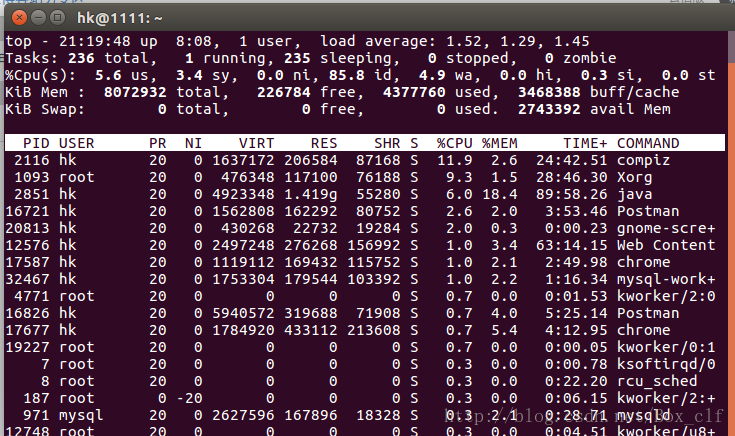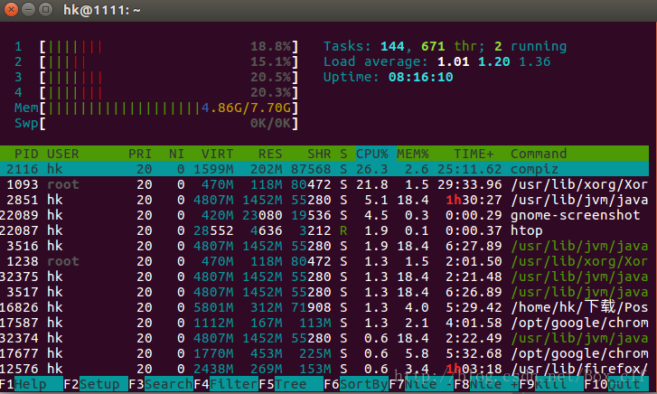 方法2:建议先使用$:sudo apt-get install htop进行安装htop工具
