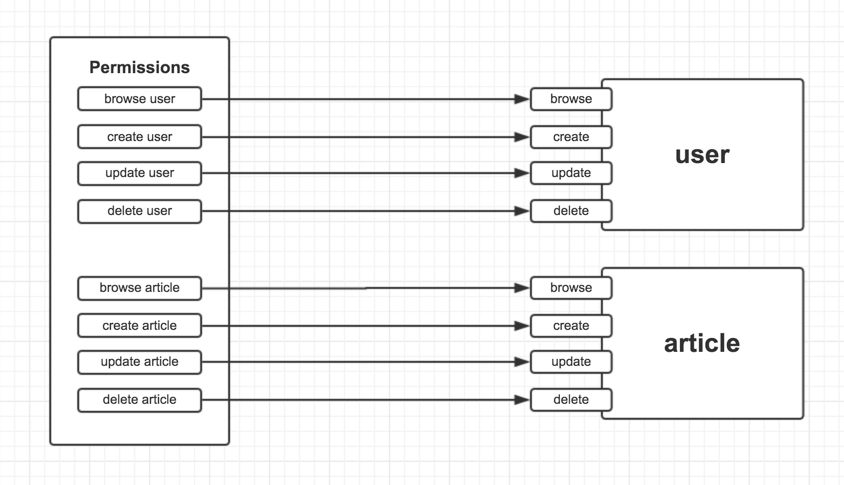 - permissions : 一种资源对应有四种权限,分别对这种资源的browse、create、update、delete
