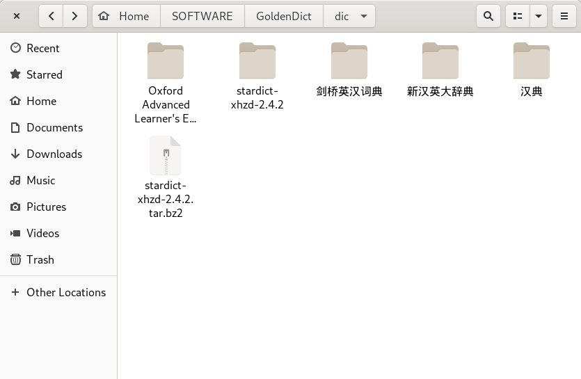 根据个人情况选择存放位置。我这里放在 ~/SOFTWARE/GoldenDict/dic/ 下,.tar.bz2 的压缩文件右键解压即可。