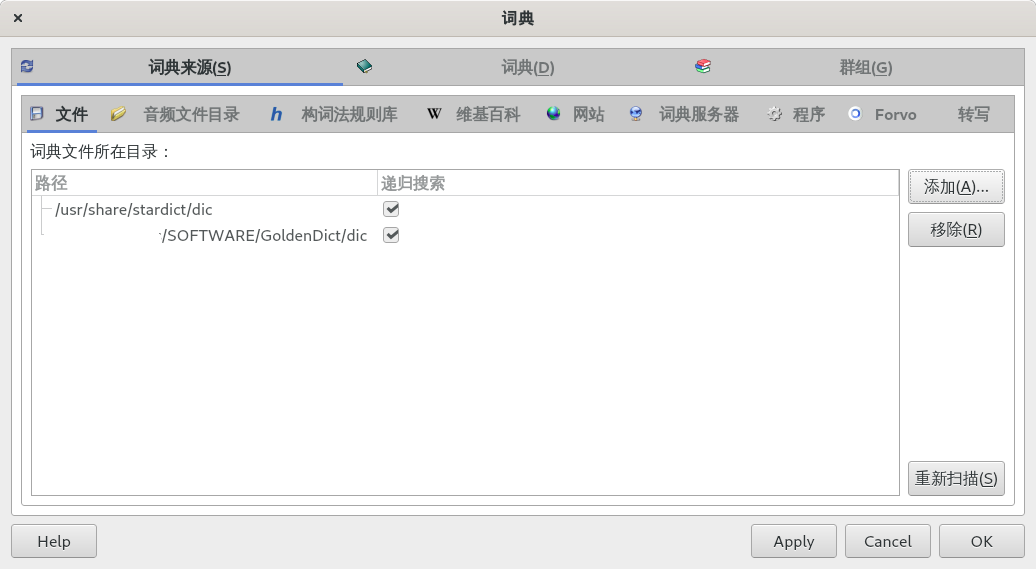 选择 编辑 > 词典 > 词典来源 > 文件 > 添加 选择上一步的词典位置打开,点击 重新扫描 完成后 Apply 应用,切换到 群组 选项卡接着完成下一步词典分组。