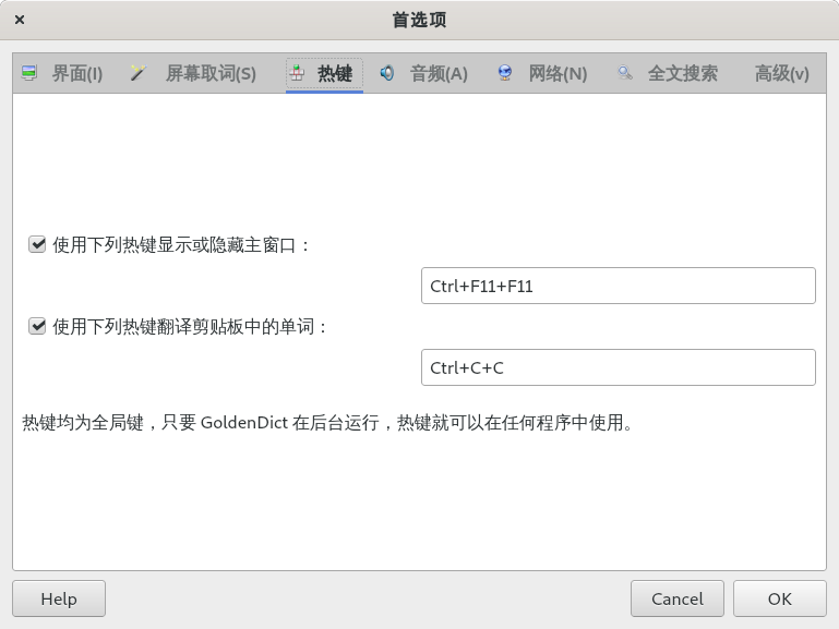 热键 Ctrl+C+C 的意思是,选中需要翻译的词句,按住 Ctrl 再按两下 C 键 ,就能呼唤 GoldenDict 帮你翻译。
