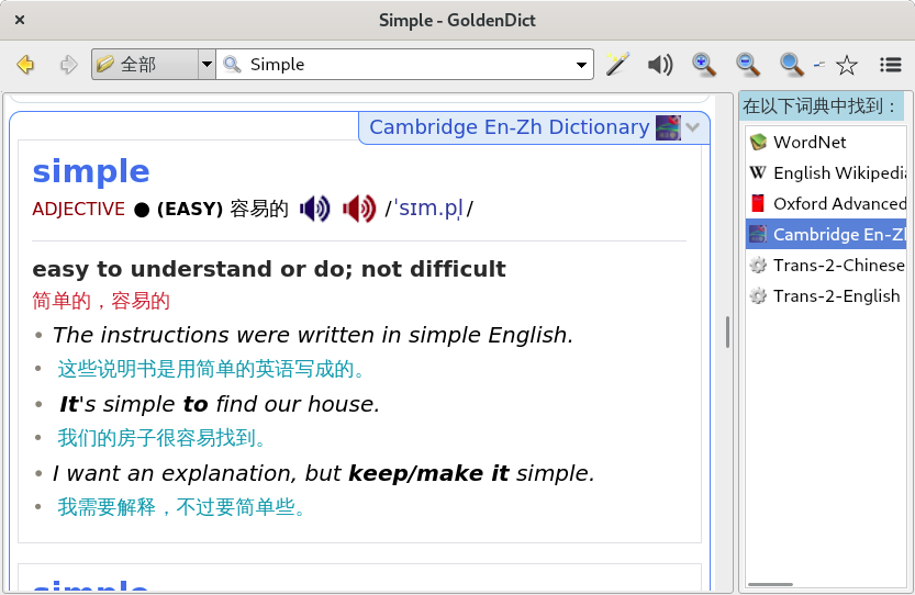 这个词典主要用于简单查询。有意思的是,我下载的离线版词典竟然查不到 Cambridge 这个单词。不过有在线版可以用:https://dictionary.cambridge.org/dictionary/english-chinese-simplified/