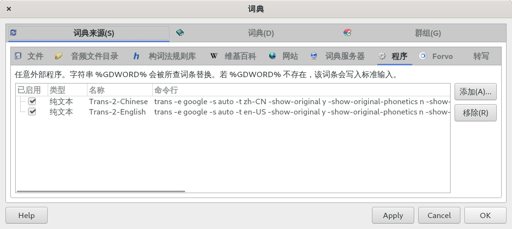 第二步:编辑 > 词典 > 词典来源 > 程序 > 添加,进行如下配置