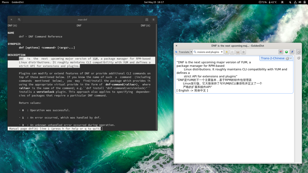 对于日常查询,离线字典已够用。但是如果我们需要翻译长文,可以添加在线的 google translate (Linux):
