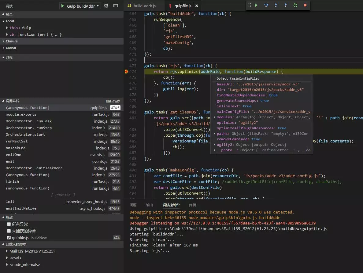 gulp开发中目录路径和活动对象都是较为令人苦恼的,通过vscode进行调试能方便很多,虽然webstorm在已经集成gulp调试,并且读取了所有task更佳方便,然而他卡啊!
