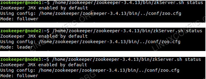 In Zookeeper ensemble out of three servers, one will be in leader mode and other two will be in follower mode. You can check the status by running the following commands.
