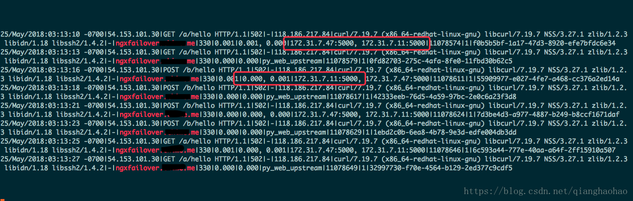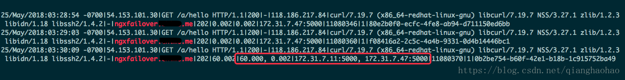 在这种情况下,通过 curl 多次发送 GET 和 POST 请求,发现不管怎么请求,返回都是正常状态,如果 Nginx 发生了失败尝试操作,那么会在 Nginx access 日志中的 upstream 字段看到有两个服务器的地址。