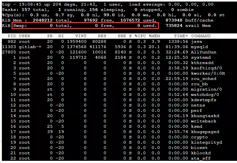 然后输入reboot重启即可,重启后使用top命令查看任务管理器,如果看到如下KiB Swap后均为 0 就说明关闭成功了。