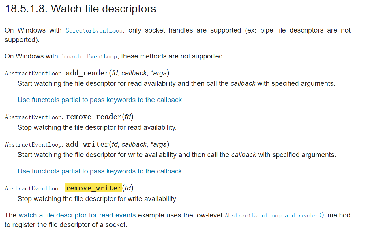 Python 官网关键函数介绍:https://docs.python.org/3.6/library/asyncio-eventloop.html?highlight=remove_writer#watch-file-descriptors