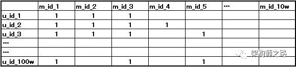 交叉处,“1”代表用户喜爱这部电影,数据来自日志
