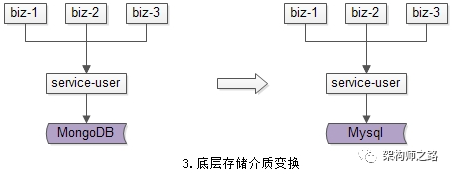 (3)底层存储介质变化:底层存储引擎由一个数据库换为另一个数据库。