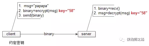 客户端和服务端提前约定好加密算法,在传递消息前,先协商密钥