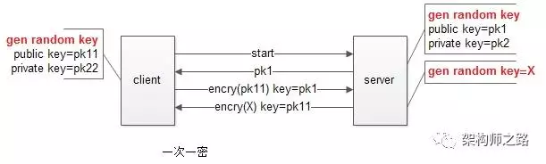 客户端随机生成公私钥对(公钥pk11,私钥pk22),并将公钥pk11,通过pk1加密,传给服务端