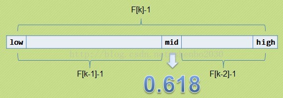 大家记不记得斐波那契数列:1, 1, 2, 3, 5, 8, 13, 21, 34, 55, 89…….(从第三个数开始,后边每一个数都是前两个数的和)。然后我们会发现,随着斐波那契数列的递增,前后两个数的比值会越来越接近0.618,利用这个特性,我们就可以将黄金比例运用到查找技术中。
