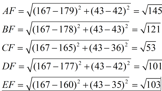 下面我们用欧式距离分别算出F离训练样本的欧式距离,然后选取最近的3个,多数类别就是我们最终的结果,计算如下: