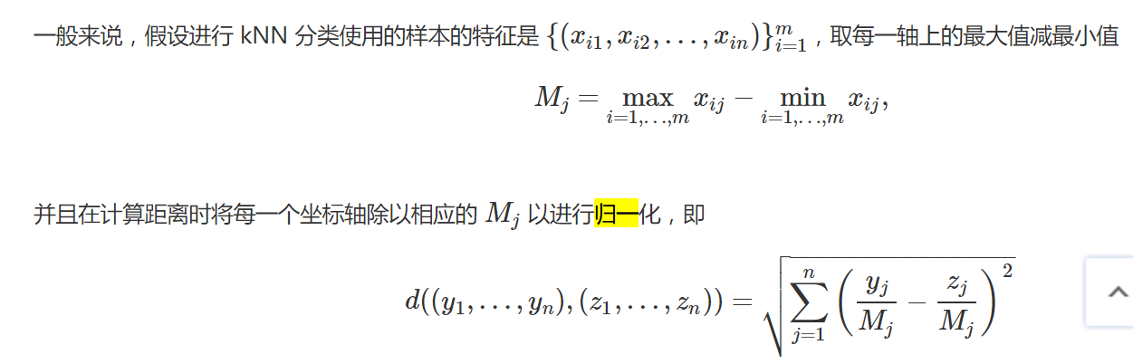 这样问题就来了,一个女性的脚43码的可能性,远远小于男性脚43码的可能性,那么为什么算法还是会预测F为女性呢?那是因为由于各个特征量纲的不同,在这里导致了身高的重要性已经远远大于脚码了,这是不客观的。所以我们应该让每个特征都是同等重要的!这也是我们要归一化的原因!归一化公式如下: