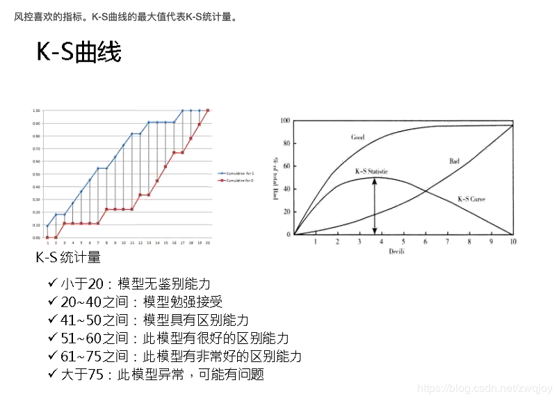 实际上是就是你建立好模型后,按照评分从大到小排列后:检验你所谓的好客户和坏客户两类客户分布的差异性,即模型区分度。分布根据好坏两个客户评分的累积密度分布曲线,画出来的:比如好坏客户共100个,按照评分排序后前百分之十的客户即10个,其中好的客户有8个,坏的客户有2个(总体样本中好客户80个,坏客户20个),那么前10%的客户的累积密度为:好客户10%,坏客户10%。同理前20%的客户中其中好的客户有15个,坏的客户有5个那么前20%的客户的累积密度为:好客户18.75%,坏客户25%
