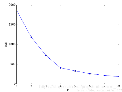 当k小于真实聚类数时,由于k的增大会大幅增加每个簇的聚合程度,故SSE的下降幅度会很大,而当k到达真实聚类数时,再增加k所得到的聚合程度回报会迅速变小,所以SSE的下降幅度会骤减,然后随着k值的继续增大而趋于平缓,这个最先趋于平缓的点就是合适的K值。