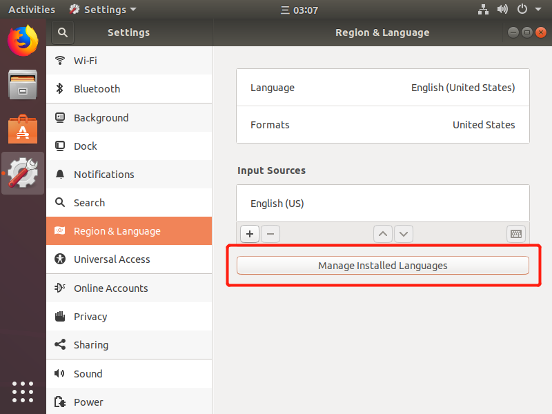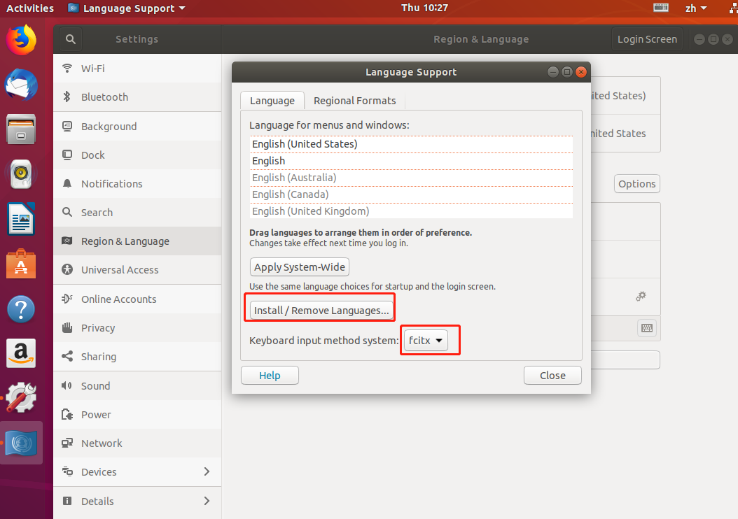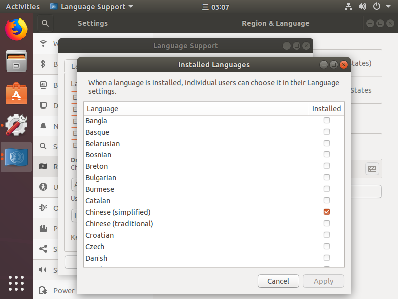 System Settings–>LanguageSupport–>Install/RemoveLanguages选中chinese,点击Apply应用即可,等待下载安装完成。
