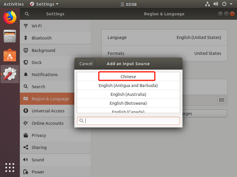 选择Chinese(若没有点击Other在里面找或者搜索),此时可以看到相关的选项(pinyin,五笔),选择Intlligent Pinyin即可