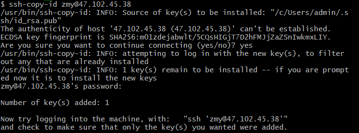 - 将公钥id_rsa.pub拷贝到目标机器上 scp ~/.ssh/id_rsa.pub zmy@47.102.45.38:~/ 这行命令将当前用户的公钥拷贝到远程机器的root用户目录下