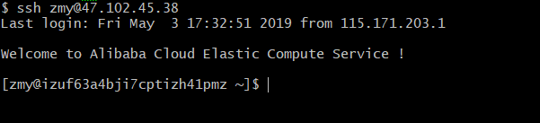 - exit #退出远程机器 这时已经返回到当前机器,再执行ssh zmy@47.102.45.38就不再需要输入密码了