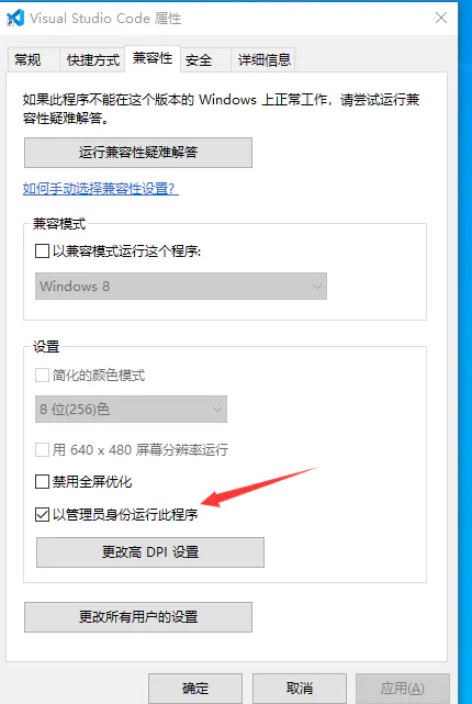 一、vscede创建快捷方式,右键属性-兼容性-以管理员身份运行此程序